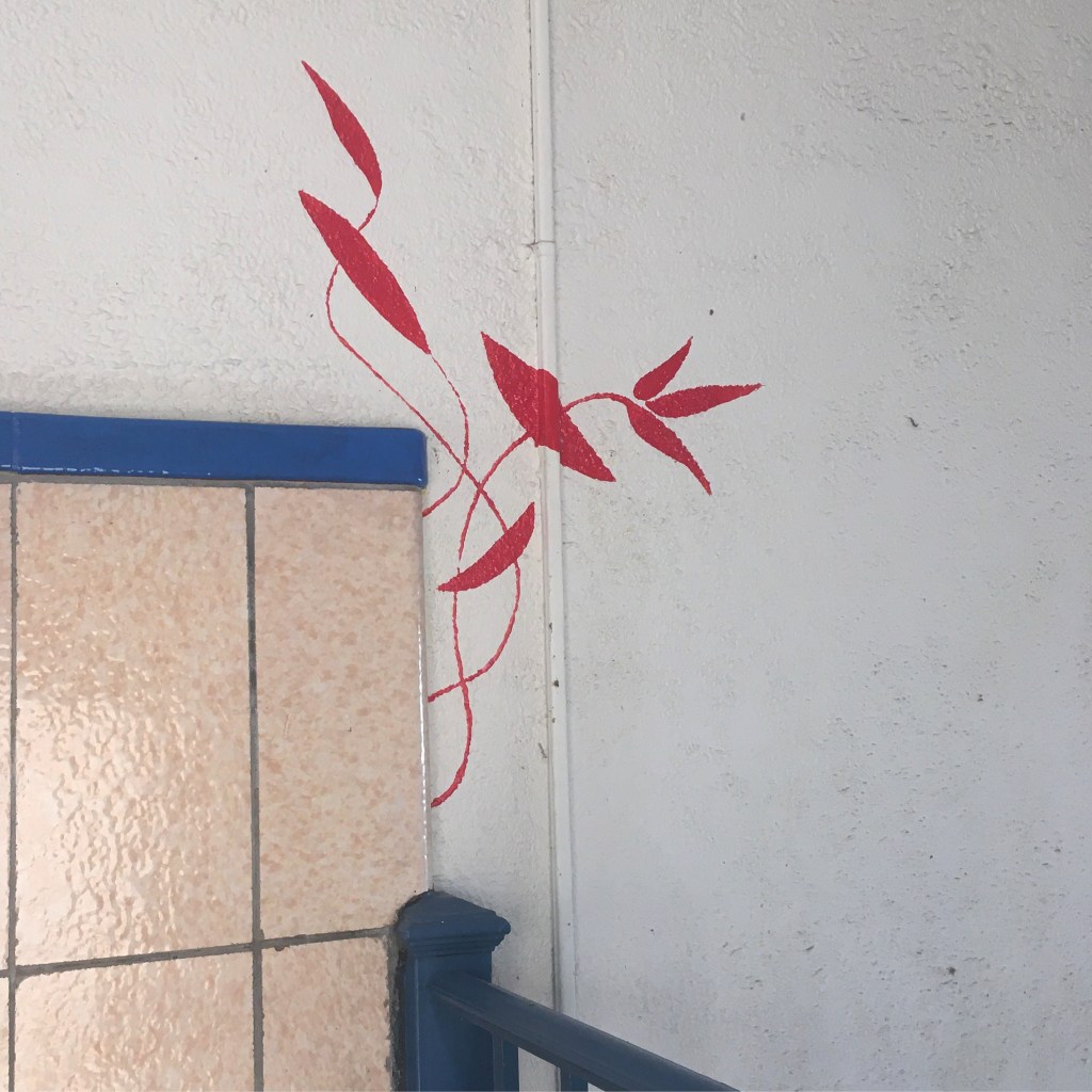 The drive to Beacon was all almost-green, everything on the verge of displaying springtime growth. The red flourishes on the wall below were part of a larger mural in the KuBe, which inhabits an old school building in Beacon, NY.