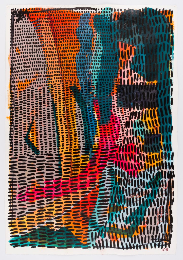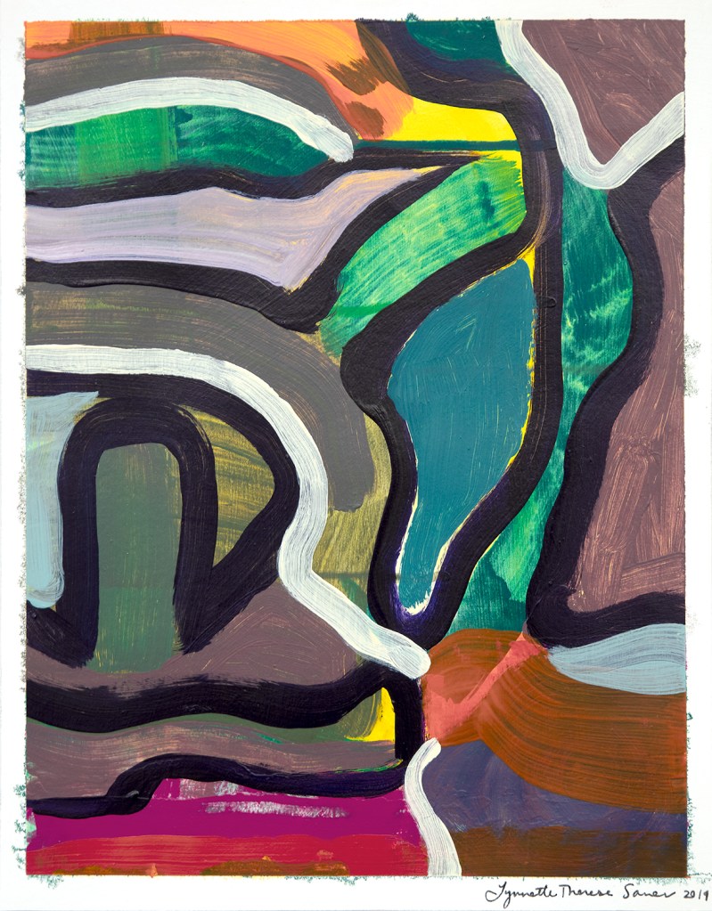 Return, 18×24 inches, acrylic and oil on paper, 2018 Layered Practices I, 22×30 inches, oil, acrylic, ink, and collage on gessoed paper, 2020Layered Practices II, 22×30 inches, oil and acrylic on gessoed paper, 2021